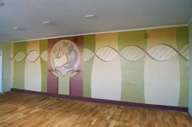 Горизонтально по всій стіні показано спіраль ДНК – нуклеїнова кислота, яка відповідає за збереження та передачу спадкової інформації. Це зображення дасть учням розуміння першопричин виникнення всього живого на планеті.