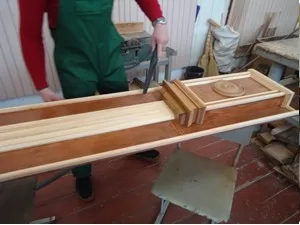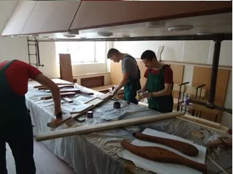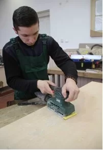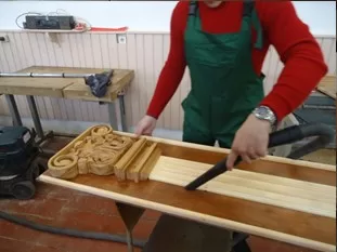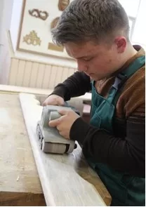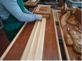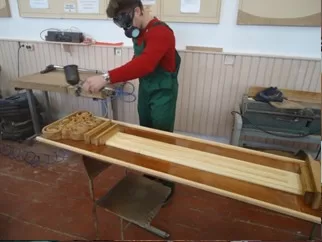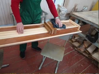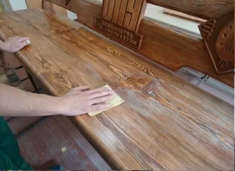 Поверхні дерев’яних виробів пошліфовано ручним та механізованим способом шліфпапером №150-200. Плоскі та рівні поверхні виробів шліфуємо за допомогою шліфмашинки, рельєфні та криволінійні – вручну.