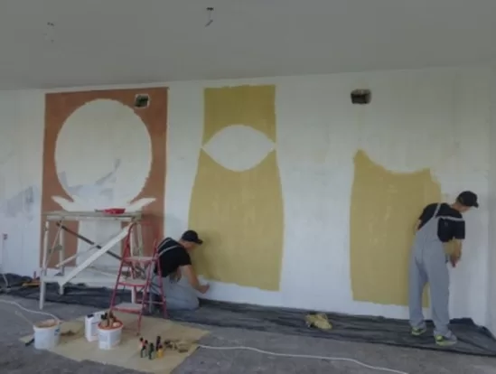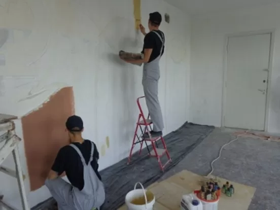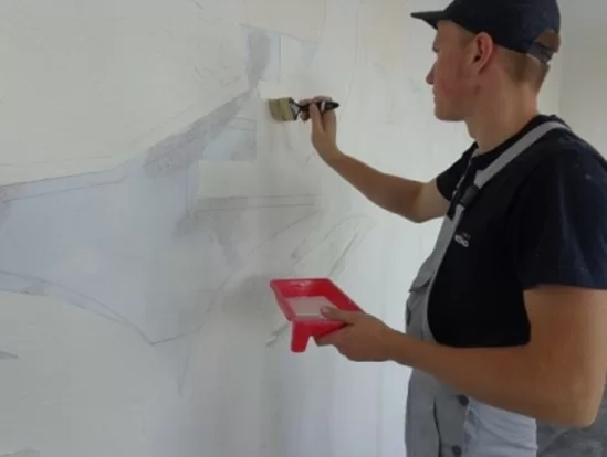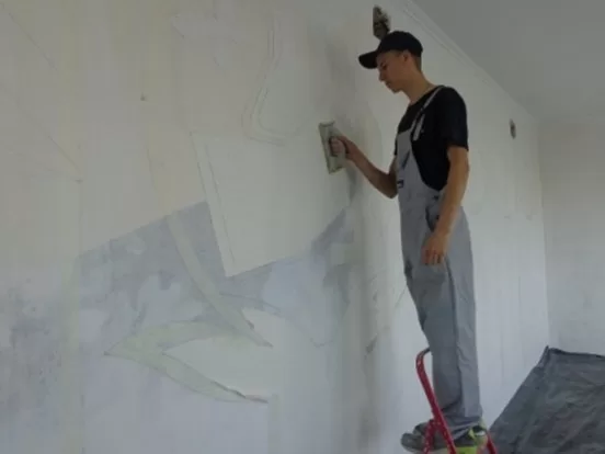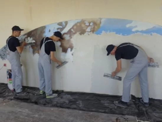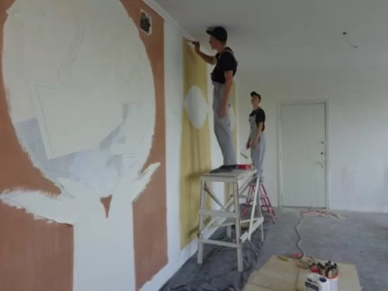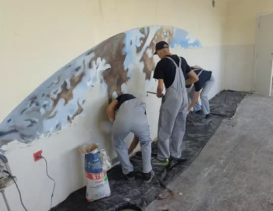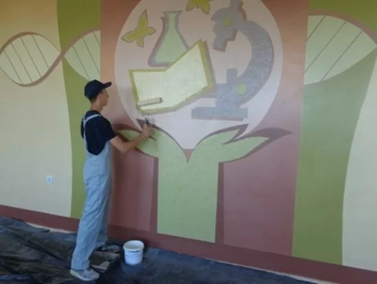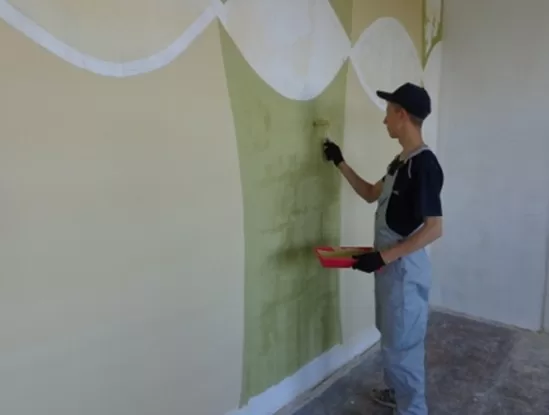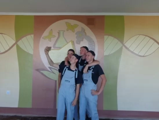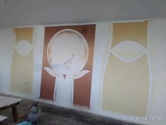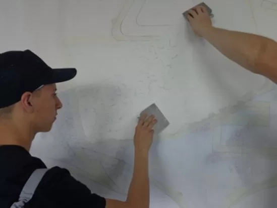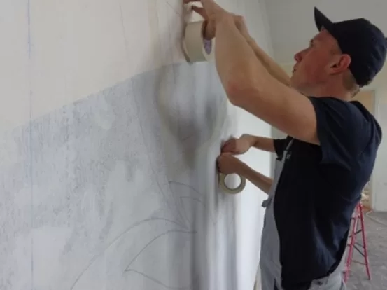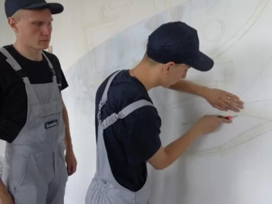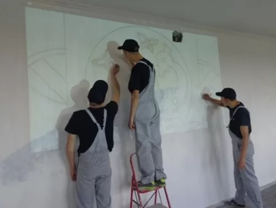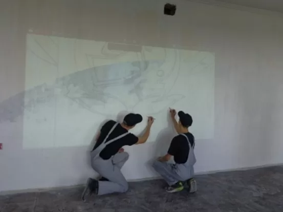 Виконано такі роботи: Перенесення малюнка на стіну за допомогою ноутбука та проектора. Обведення контурів малюнка на стіні. Розмічання ліній малярним шнуром. Перевірка розмірів та корекція за допомогою контрольно- вимірювальних інструментів: лазерного рівня, будівельного рівня.