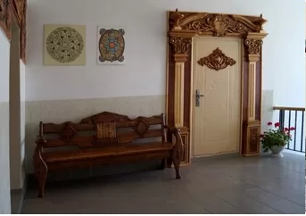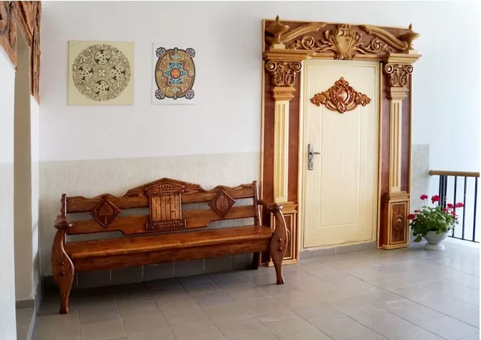 Декоративна різьблена лавка і декоративний різьблений дверний портал в музей дипломних робіт учнів відділення художніх ремесел Луцького ВПУ будівництва та архітектури, які декорувались і опоряджувались лакофарбовими матеріалами ТМ «VIDARON».