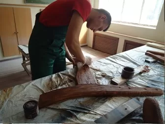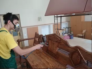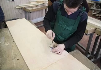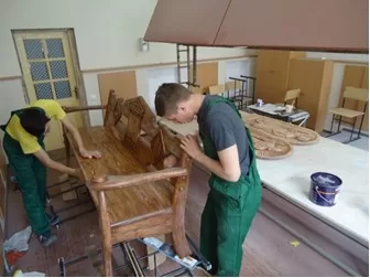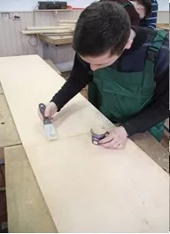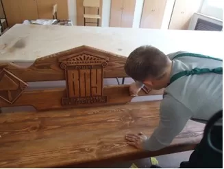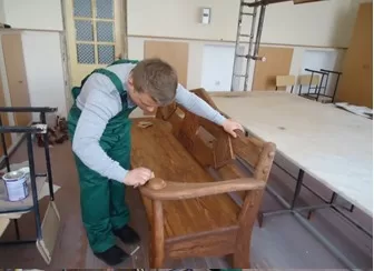 Роботи почались з заповнення тріщин та нерівностей на поверхні виробів використовуючи акрилову шпаклівку для деревини – VIDARON SZPACHLA DO DREWNA. Нанесення шпаклівки на вироби здійснюємо за допомогою металевого шпателя. В місцях ширших і глибших щілин шпаклівку наносили двічі з технологічною перервою на висихання. Деталі декоративної лавки оброблялись в техніці брашування.