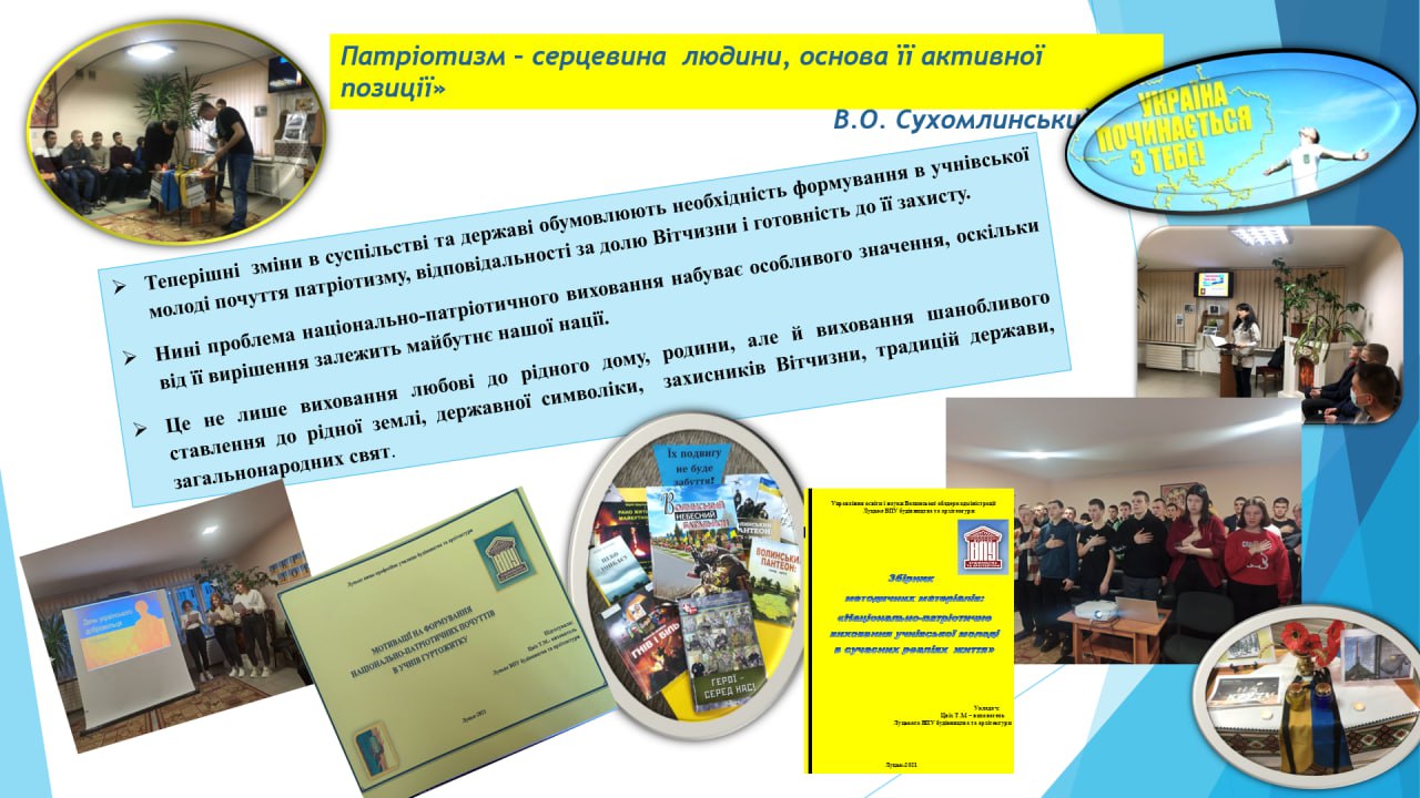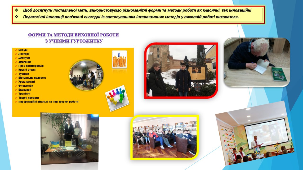Виховна робота з учнями, які проживають у гуртожитку, – це складова частина всього навчально-виховного процесу. Вихователі мають справу з майже сформованими молодими людьми, в яких досить сталі риси характеру, свої погляди та розуміння життя. Тому завдання вихователя – багатогранні та різнопланові. Серед усього іншого – спрямувати розвиток особистості у правильне русло, показавши можливість бути у гармонії не лише з собою, а й з тими хто поряд. Жити без страху і насилля, виховувати бережливе ставлення до людини, її гідності та людського життя як найвищої цінності, виховувати патріотичні почуття і любов до України. Також метою вихователя є допомога здобувачеві освіти у самовизначенні і професійному пошуку себе в сучасному світі.