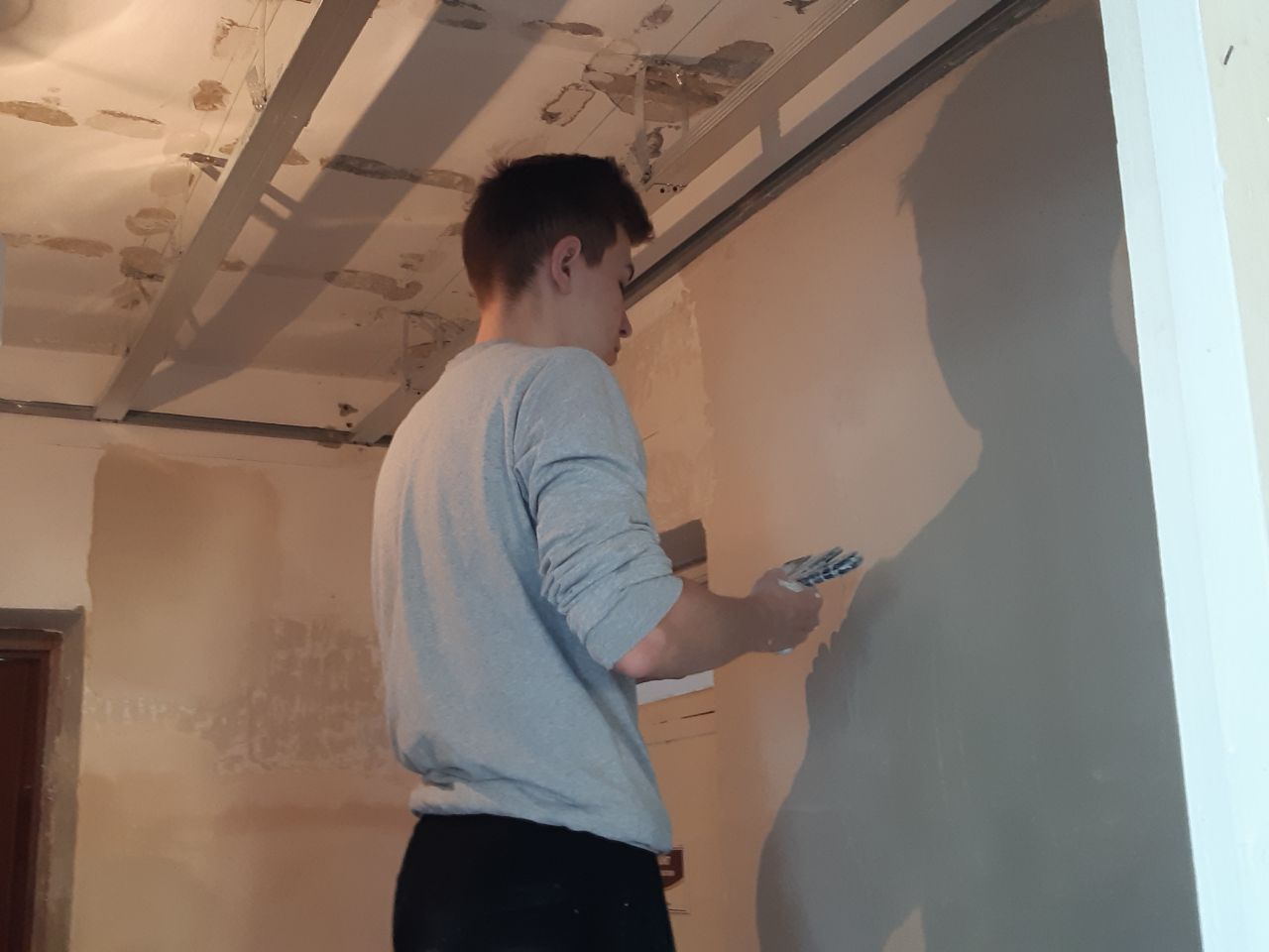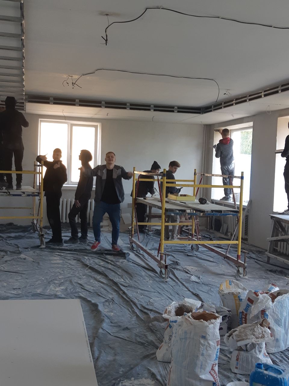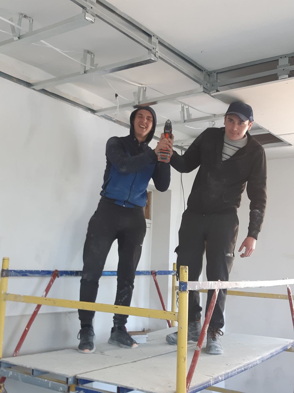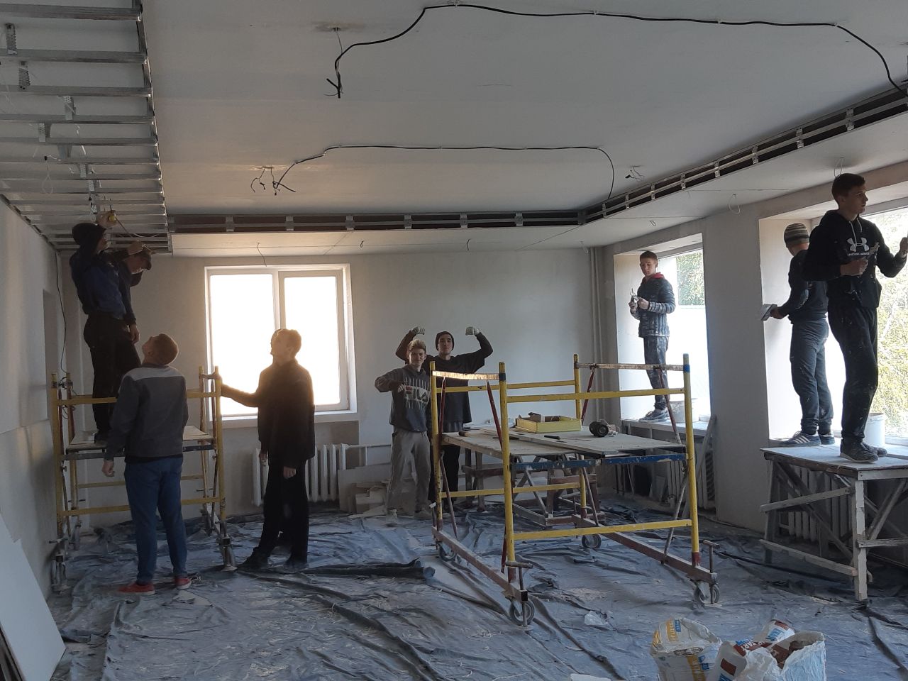 Під наглядом досвідчених майстрів учні груп Т-3 та Т-4, які навчаються за професіями маляр, штукатур та монтажник гіпсокартонних конструкцій, виконують ремонтні та оздоблювальні роботи кабінету інформаційних технологій, використовуючи сучасні будівельні матеріали.