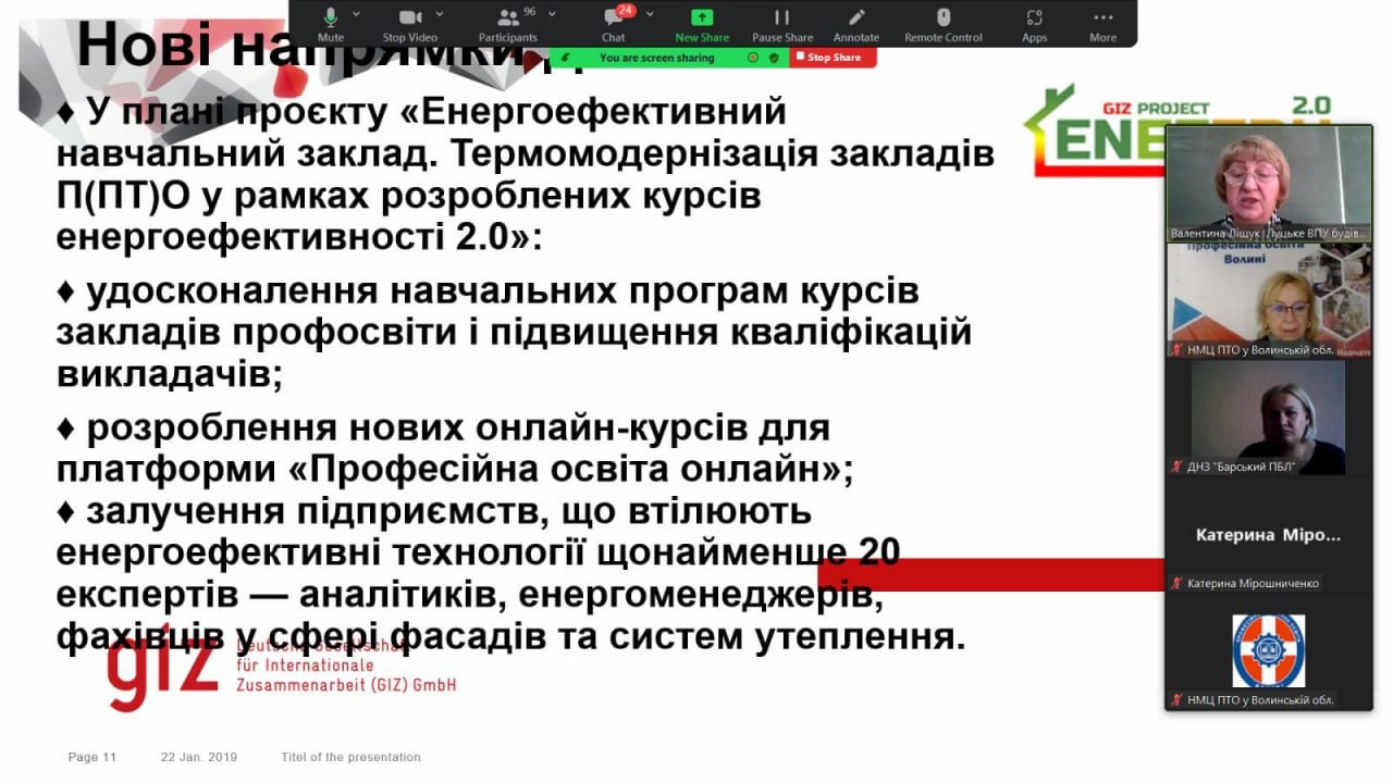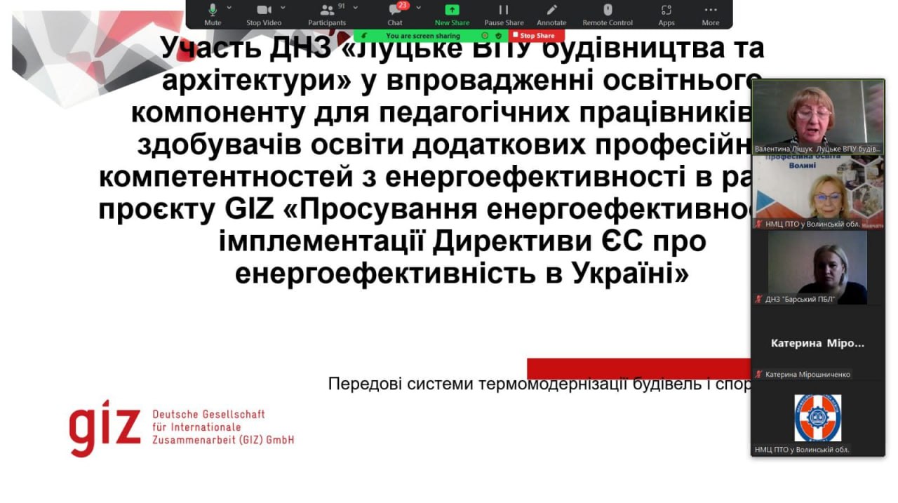 У рамках Європейського року умінь та навичок 24 жовтня 2023 року розпочався всеукраїнський онлайн-марафон «Кращі практики формування енергоефективних та екологічних компетентностей у здобувачів освіти ЗП(ПТ)О» організований навчально-методичним центром ПТО у Волинській області. Викладач спецпредметів ДПТНЗ «Луцьке ВПУ будівництва та архітектури» Валентина Ліщук виступила із доповіддю «Впровадження освітнього компоненту для педагогічних працівників та здобувачів освіти додаткових професійних компетентностей з енергоефективності в рамках проєкту GIZ «Просування енергоефективності та імплементації Директиви ЄС про енергоефективність в Україні».