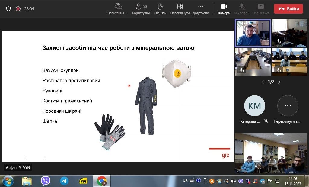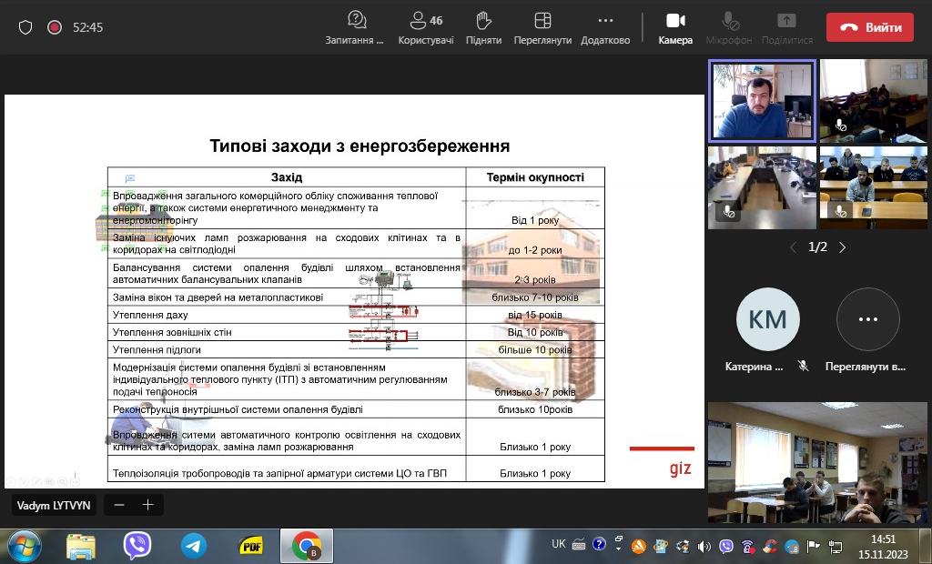 Здобувачі освіти, майстри виробничого навчання та викладачі спецдисциплін нашого училища відвідали онлайн-тренінг, який був присвячений питанням термомодернізації та енергоефективності. Про сучасні технології та матеріали для забезпечення термоізоляції внутрішніх комунікацій будівель і споруд розповів Вадим Литвин – енергоаудитор, експерт МГО «Центр сприяння житловим та муніципальним реформам».