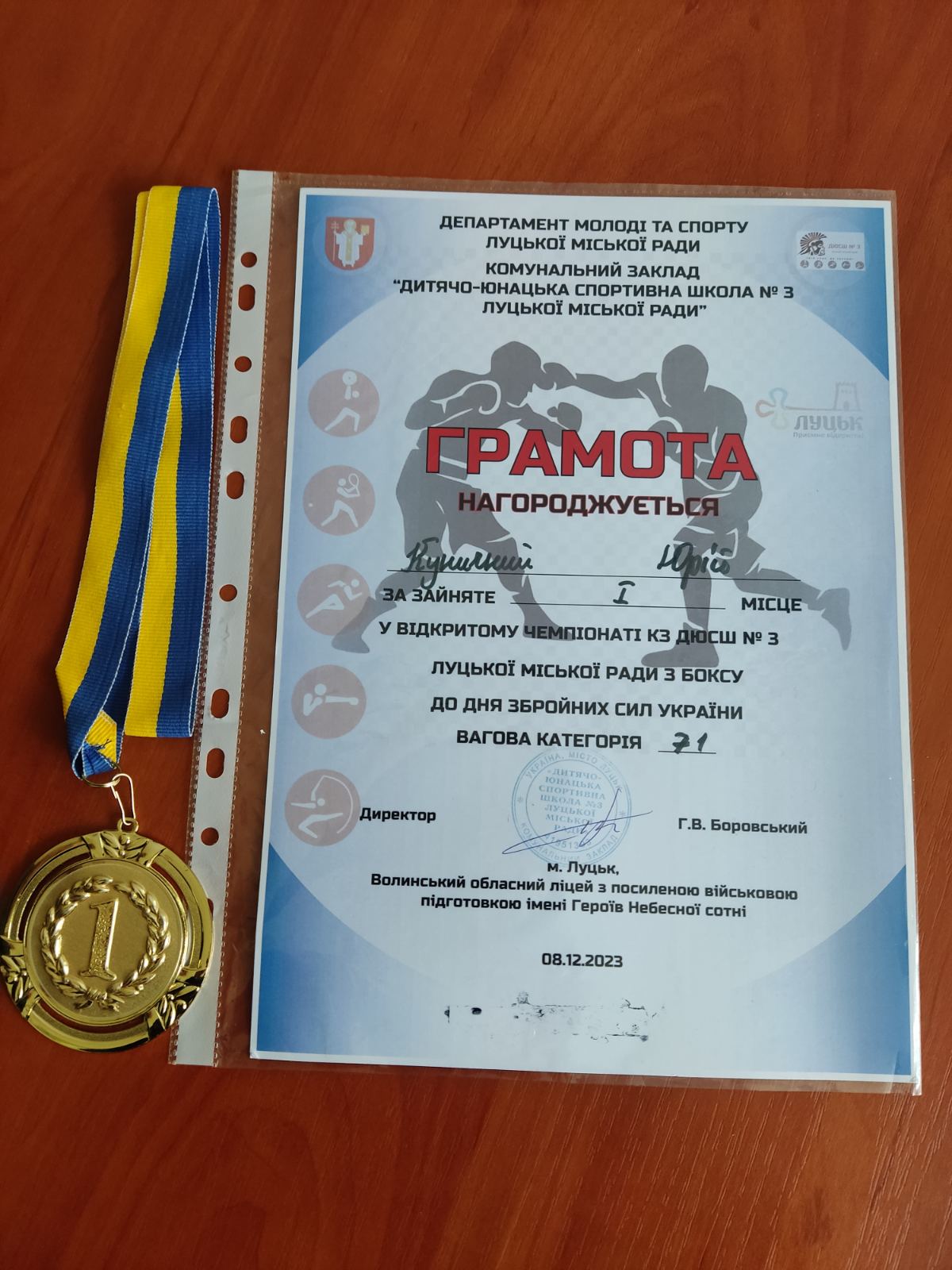 8 грудня 2023 року в дитячо-юнацькій спортивній школі №3 Луцької міської ради відбувся відкритий чемпіонат з боксу, присвячений дню Збройних сил України. У чемпіонаті взяли участь учні групи МС-21 Луцького ВПУ будівництва та архітектури Куничник Юрій та Доценко Назар і вибороли І – місце. Вітаємо переможців з важливим спортивним досягненням та бажаємо нових перемог!