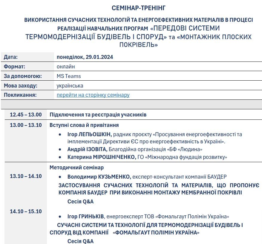 ?‍? Запрошені речники, зокрема, пан Ігор ГРИНЬКІВ, енергоексперт ТОВ “Фомальгаут Полімін Україна”, презентував сучасні системи та технології для термомодернізації будівель і споруд. Виклавши теоретико-практичну частину своїх доповідей, спікери приділили суттєву увагу Q&A сесії. Саме під час останньої слухачі в довільному порядку мали змогу поставити запитання, отримати відповіді та обмінятися досвідом практичної реалізації отриманих знань.