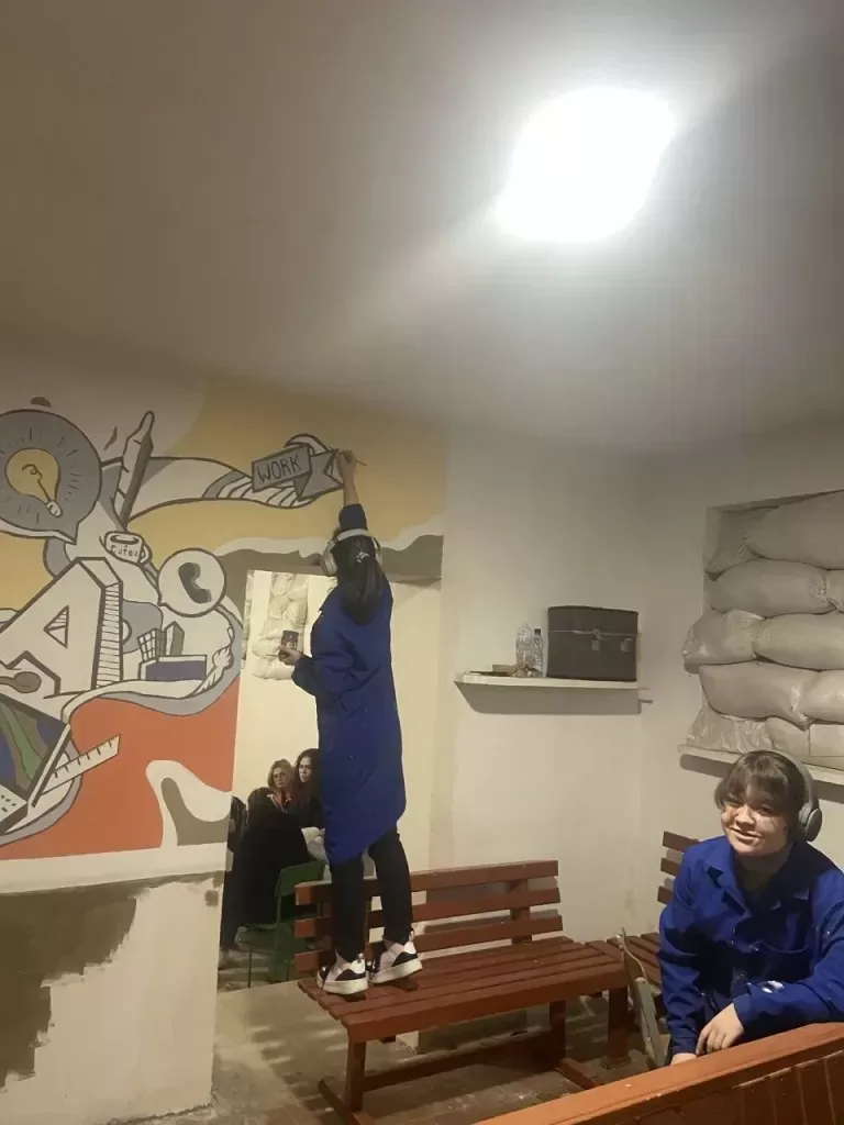 Здобувачі освіти групи ОДМР-21, які навчаються на рівні фахового молодшого бакалавра за ОПП “Декоративно-прикладне мистецтво”, зробили одне з укриттів більш затишним – створили стінопис. Приміщення тепер видається не таким похмурим і приваблює погляд своїми яскравими кольорами.