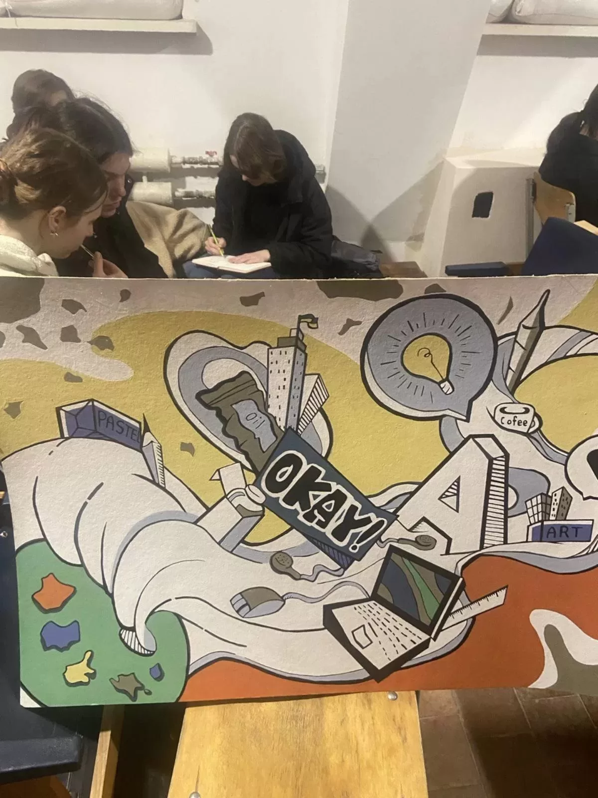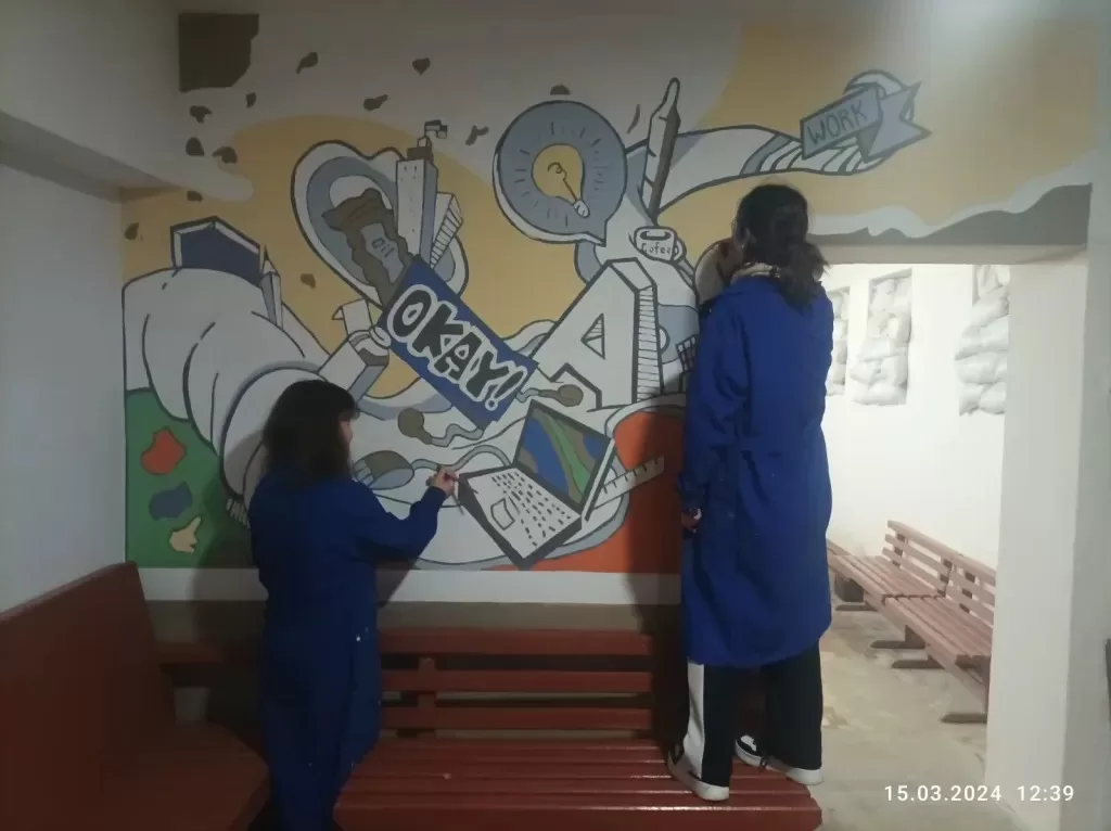 Здобувачі освіти групи ОДМР-21, які навчаються на рівні фахового молодшого бакалавра за ОПП “Декоративно-прикладне мистецтво”, зробили одне з укриттів більш затишним – створили стінопис. Приміщення тепер видається не таким похмурим і приваблює погляд своїми яскравими кольорами.