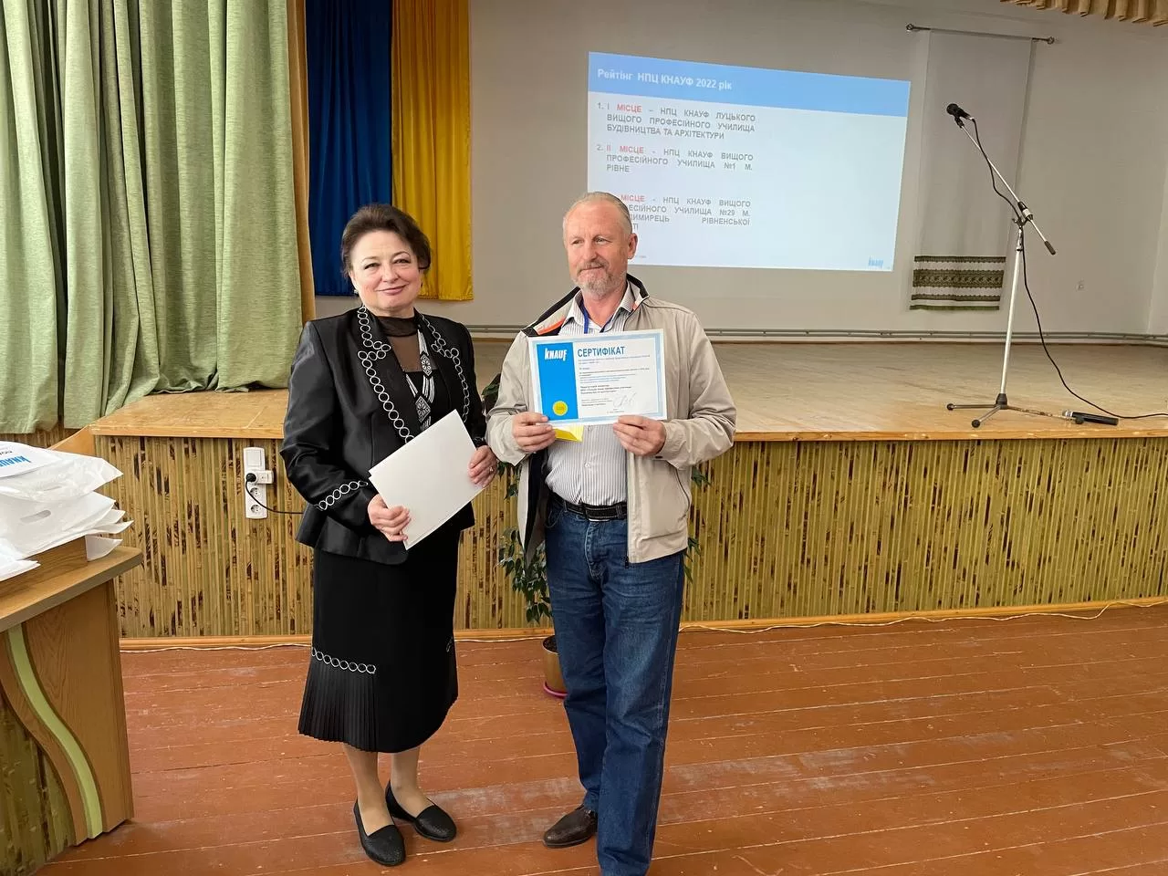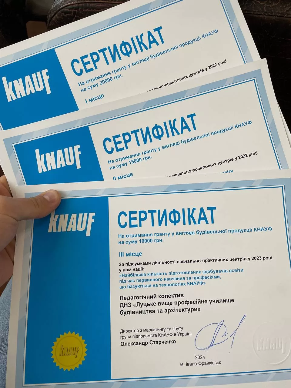 За підсумками діяльності навчально-практичних центрів у 2023 році у номінації «Найбільша кількість підготовлених здобувачів освіти під час первинного навчання за професіями , що базуються на технологіях КНАУФ» педагогічний колектив Луцького ВПУ будівництва та архітектури посів ІІІ місце та нагороджений сертифікатом на отримання гранту у вигляді будівельної продукції КНАУФ на суму 10 тис.грн.