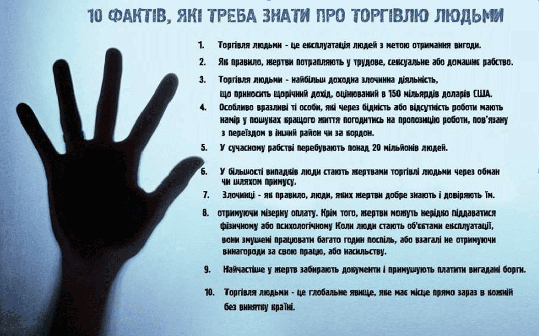 Щорічно 18 жовтня відзначається День боротьби з торгівлею людьми, спрямований на підвищення обізнаності щодо одного з найсерйозніших злочинів проти прав людини. Торгівля людьми ̶ це глобальна проблема, яка не знає кордонів і завдає шкоди мільйонам людей.
