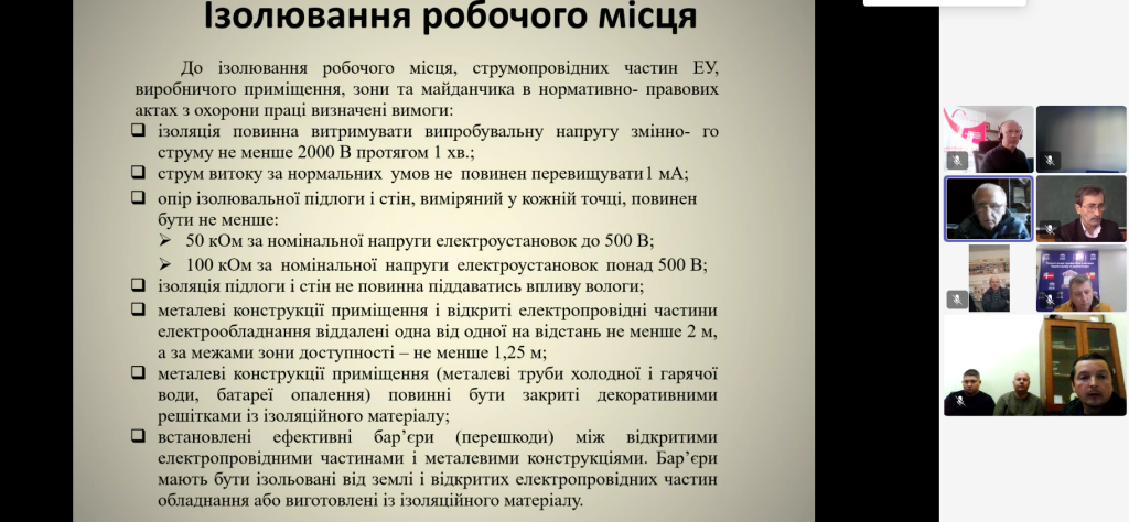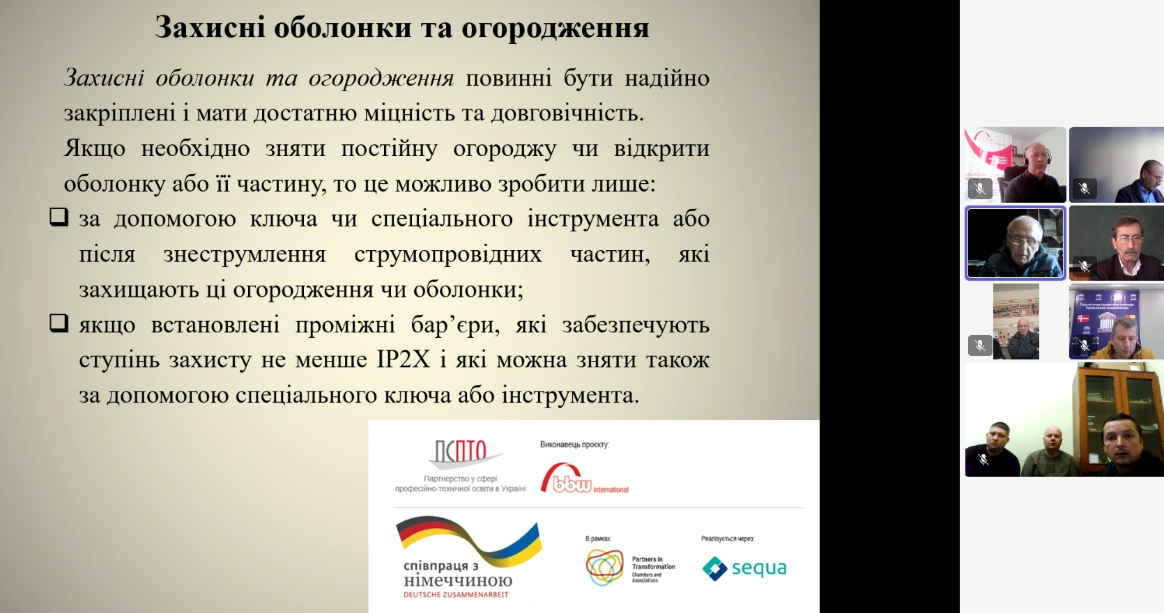 Онлайн-семінар з охорони праці у професійному напрямку «Електрик» провів віцепрезидент Львівської ТПП Роман Васильович Баран спільно з доцентом кафедри цивільної безпеки НУ «Львівська політехніка» Юрієм Володимировичем Котом. Участь у семінарі взяли майстри виробничого навчання, викладачі спецпредметів з професії електромонтажник, інженер з охорони праці закладу освіти.