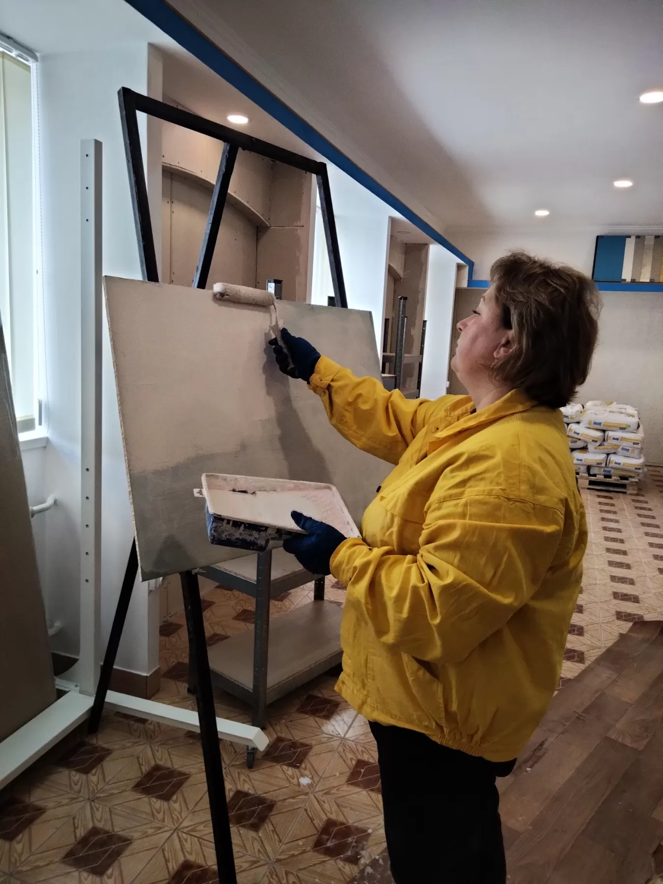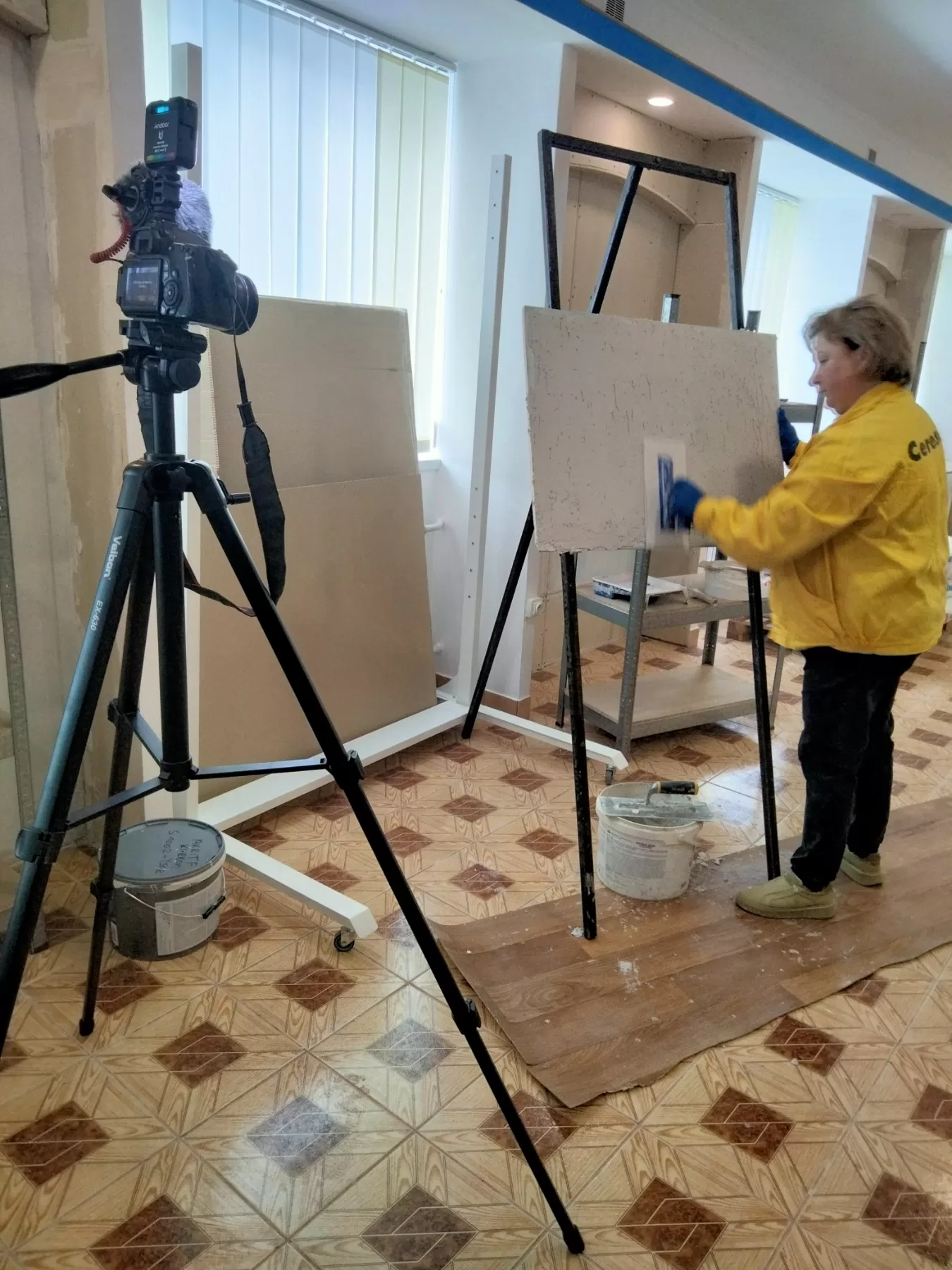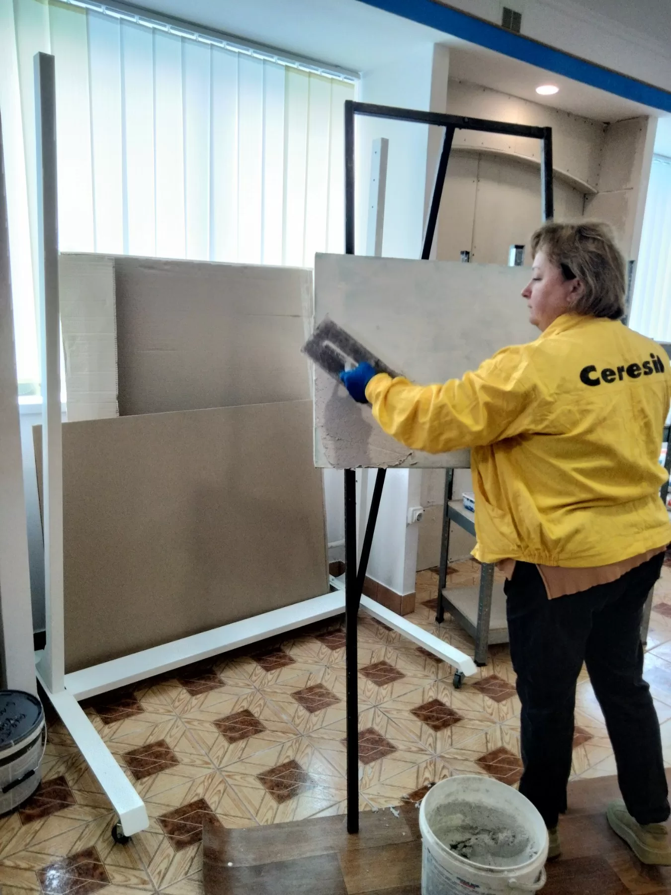 Майстер продемонструвала технологічний процес ґрунтування основи, приготування та нанесення полімерцементної штукатурки; мозаїчної штукатурки; силіконової фарби.