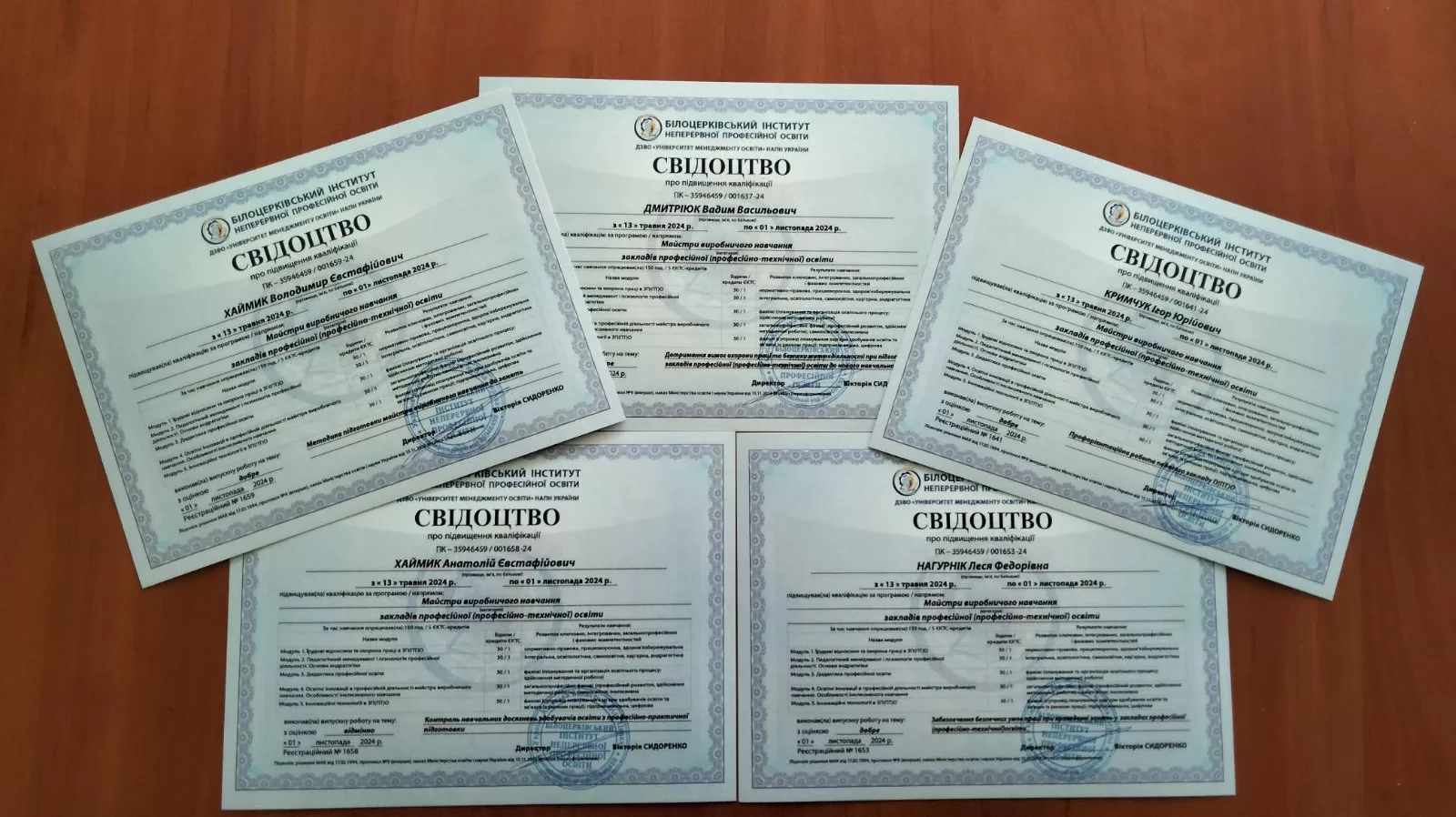 Протягом травня – листопада 2024 року майстри виробничого навчання нашого закладу освіти проходили курси підвищення кваліфікації при Білоцерківському інституті неперервної професійної освіти при ДЗВО «Університет менеджменту освіти» НАПН України. Курсанти успішно засвоїли теоретичний матеріал з 5 модулів та захистили курсові роботи з актуальних тем методики, психології та дидактики професійної освіти. Бажаємо успіхів у впровадженні нових підходів та методів викладання у професійній діяльності!