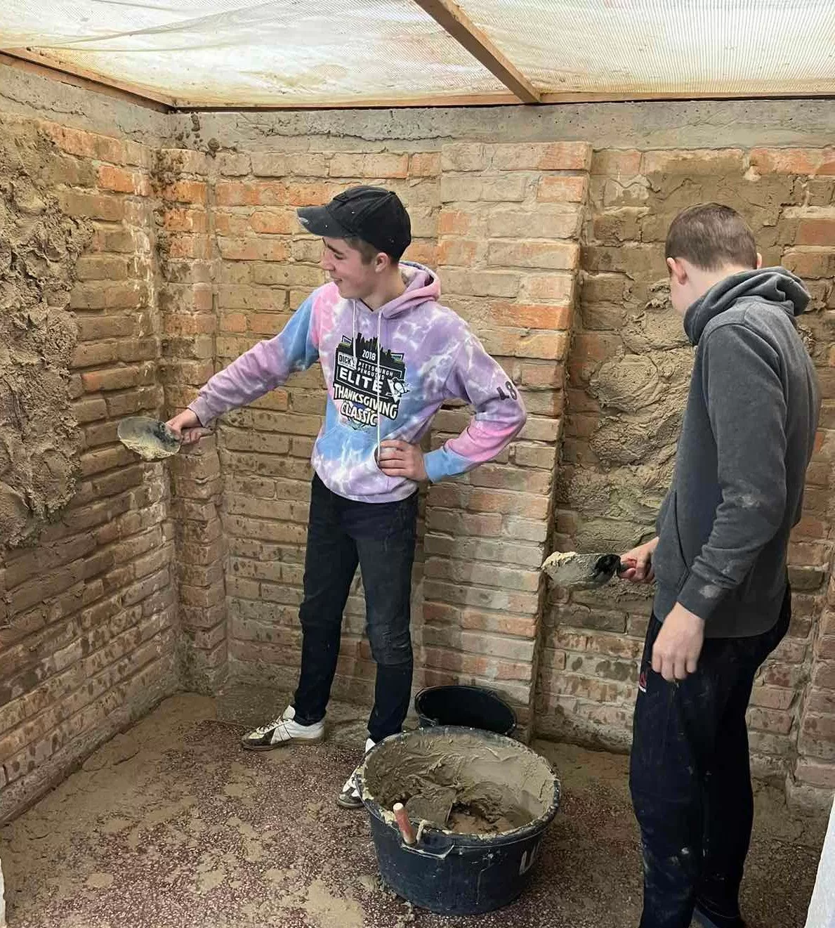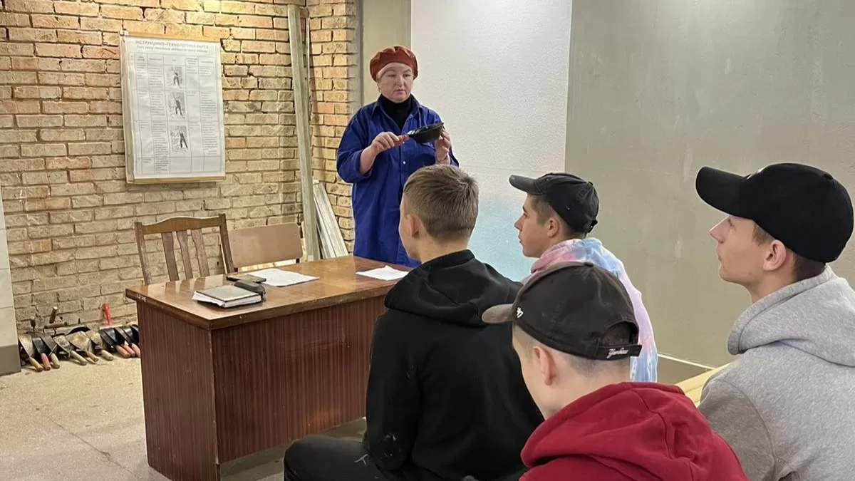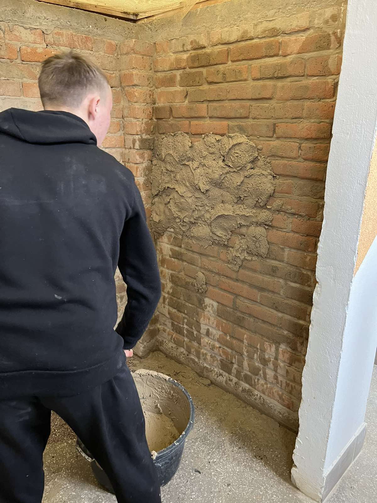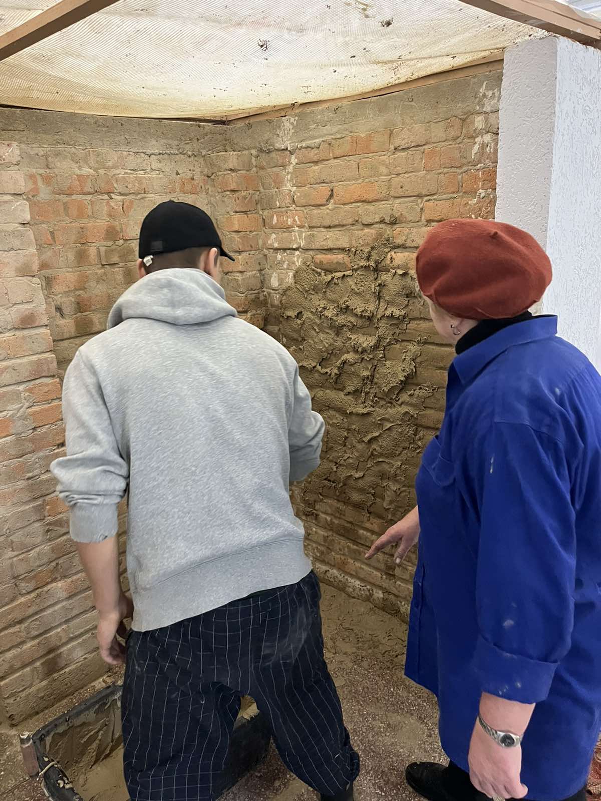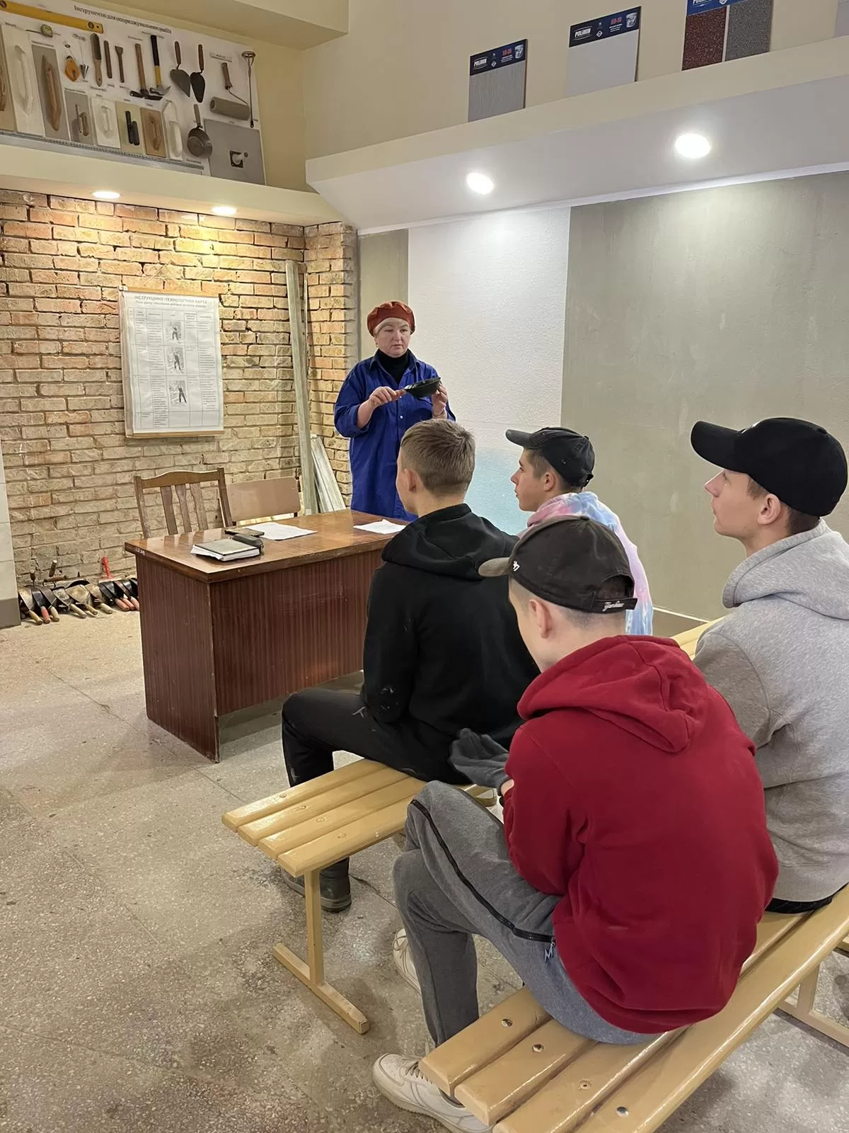 Вона продемонструвала, як правильно тримати руку для точного накидання розчину, що дозволяє підвищити ефективність роботи та зменшити фізичне навантаження на тіло. Також обговорювалися раціональне використання матеріалів і дбайливе ставлення до інструментів. Після цього учні мали можливість самостійно спробувати цю техніку, відпрацьовуючи отримані навички на практиці.