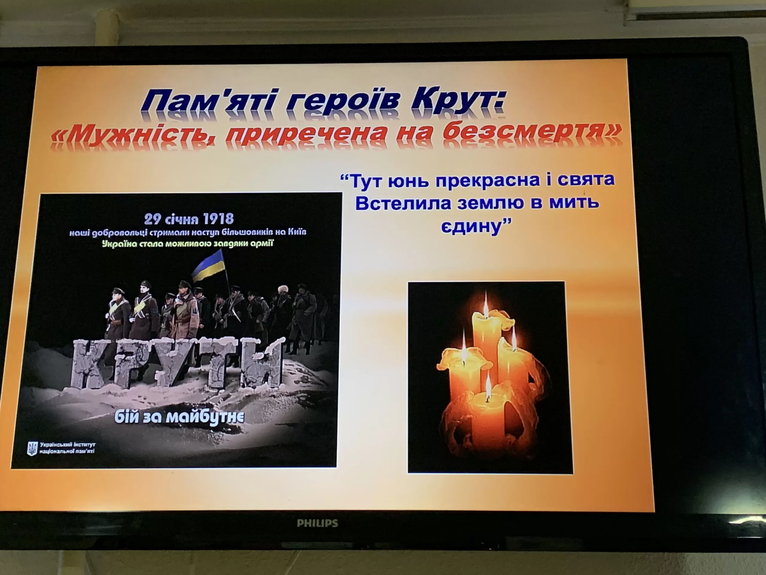 «В ці хвилини ми не можемо не сказати, що в наш час є такі ж незламні духом, незборимі борці за волю та справедливість. Сьогодні ми перейняли естафету від Героїв Крут і продовжуємо боротьбу за нашу незалежність – сказала вихователька. – Нехай пам’ять про наших героїв . які загинули під Крутами і хто віддав своє життя сьогодні – буде вічною. Нехай їхня смерть буде для нас прикладом, як треба любити свою Батьківщину».