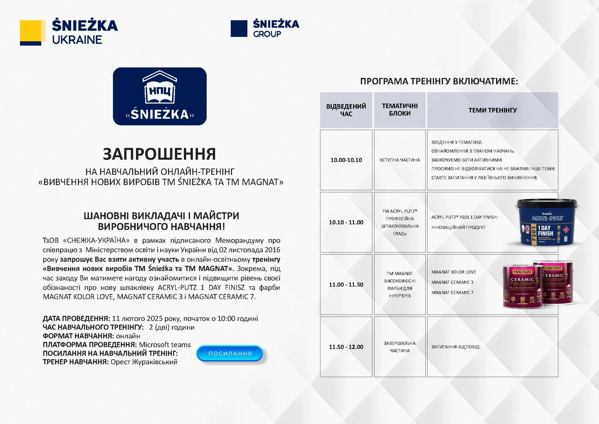 ОСВІТНІЙ ТРЕНІНГ – ВИВЧЕННЯ НОВИХ ВИРОБІВ TM SNIEZKA ТА TM MAGNAT