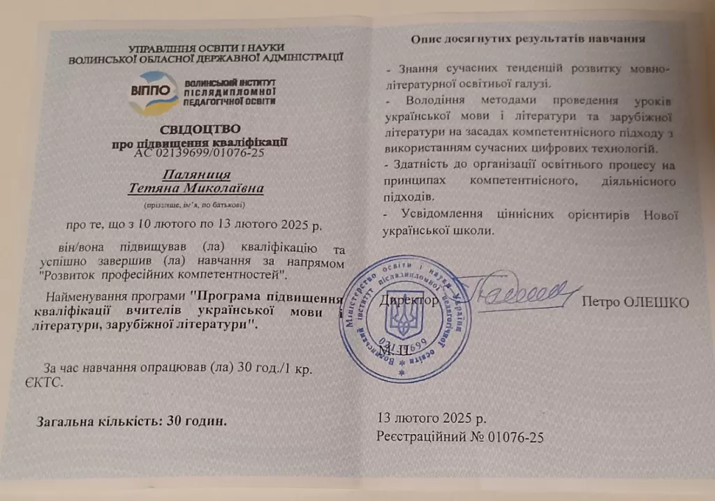 13 Лют ПІДВИЩУЄМО СВІЙ ПРОФЕСІЙНИЙ РІВЕНЬ Луцький ПКБА | ОСВІТА, Тетяна Паляниця, Тренінг | 0 Викладач української мови та літератури Тетяна Паляниця успішно пройшла курси підвищення кваліфікації у ВІППО за мовно-літературним напрямом «Розвиток професійних компетентностей». Постійне навчання та вдосконалення знань – запорука якісної освіти!