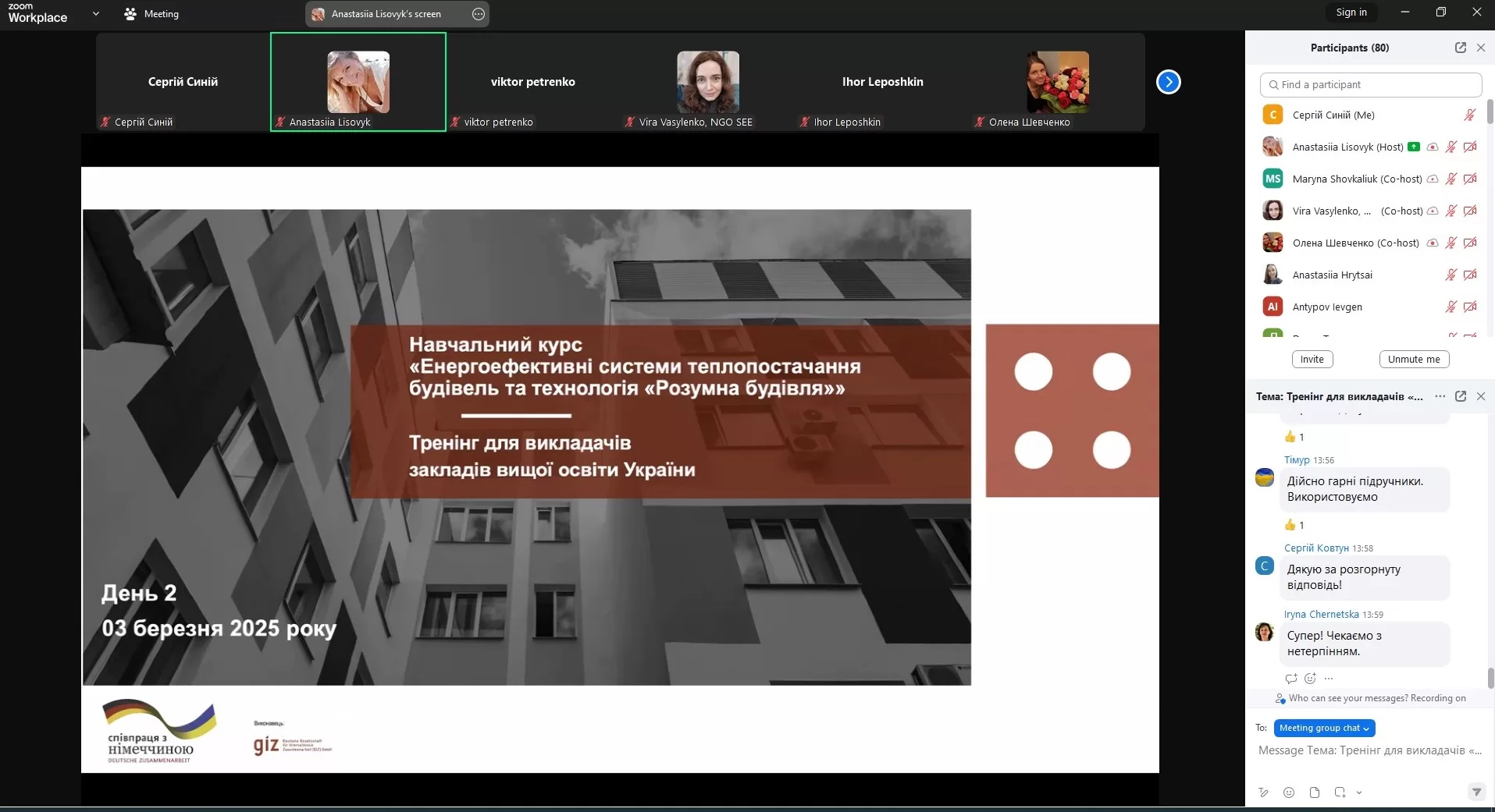 Також, модераторами разом з учасниками тренінгу було обговорено напрямки розширення впровадження елементів методології енергоефективності систем теплопостачання будівель та технології «Розумна будівля» у навчальний процес для здобувачів фахової освіти у сфері будівництва та архітектури коледжів та університетів України.
