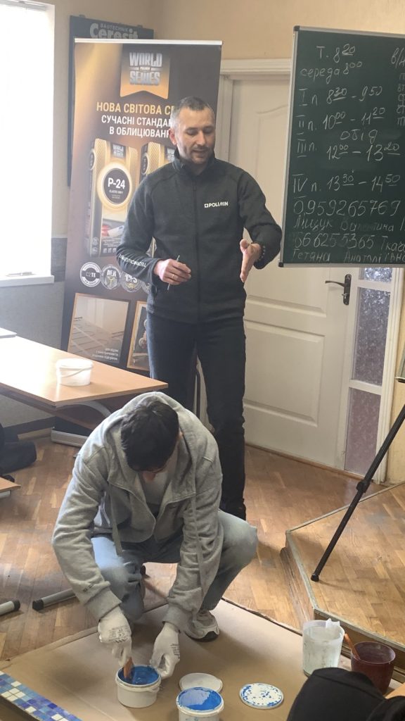 Педагогічні працівники метод. комісії опоряджувальних професій, студенти груп лицювальників-плиточників отримали не лише цікаві, а і потрібні знання при виконанні робіт із влаштування стяжок під плиткові підлоги, влаштування гідроізоляції, вибір клею для виконання облицювань, приклеювання плитки.